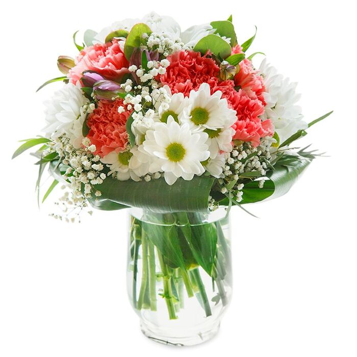 Bursting with lighthearted charm, this bouquet is a homage to the vibrant community spirit found in Southfields. Ruffled, coral-hued carnations radiate warmth, their petals lush and inviting, flanked by sprightly white daisies boasting joyful yellow-green centers. Shimmering clouds of baby's breath weave through the blooms, imparting an aura of innocence and freshness akin to a stroll through Wimbledon Park on a sunny morning. Over to the left, unopened buds tinged with purple promise future beauty, symbolizing hope and heartfelt connection. Every stem is embraced by lustrous green foliage, which fans outward to create a sumptuous, full-bodied silhouette. Presented in a crisp white gift bag, the bouquet balances elegance and approachability-perfect for gifting as a birthday surprise along Replingham Road or bringing brightness to a neighbour's day. Shot against a flawlessly white background, every colour and texture shines, offering a reminder of how thoughtful floral design can turn ordinary days into moments worth celebrating in Southfields. Embodying the essence of Southfields in full bloom, this expertly arranged bouquet radiates happiness and gentle encouragement. At its centre lie crisp white daisies with bright green centers-a nod to the simple joys of the neighbourhood's gardens. Coral-pink carnations, ruffled and plush, pervade the bouquet, infusing warmth and delicate texture that glows softly against the smooth white background. Fluffy gypsophila clusters shimmer between the blooms, transforming the entire piece into a bouquet of sunlight and airy grace. Among the foliage- a rich interplay of matte eucalyptus and deep woodland greens - sit glimpses of unopened alstroemeria buds, blushed with soft purple and rose, promising yet more colour as the days unfold. This design, with its balanced circular shape and harmonious hues, is as suited for a festive kitchen table on Pirbright Road as for sending heartfelt thanks or cheering up a loved one anywhere in SW18. Carefully crafted by Southfields florists drawing inspiration from the peaceful parklands and friendly streets, it is a fresh and joyful choice, perfect for marking birthdays, milestones, or moments of uplift with flower delivery across the Southfields community. Radiating the easy optimism and local pride of Southfields, this bouquet gathers a lively mix of coral-pink carnations with abundant, ruffled petals at its heart-a burst of warmth and texture that invites immediate joy. Around them, white chrysanthemums and classic white daisies with green-yellow centres glimmer, much like sunlight dancing across the greens of Wimbledon Park. Wispy sprays of dainty baby's breath billow gently amongst the larger blooms, softening the whole arrangement with airy grace. A few tightly closed magenta alstroemeria buds emerge from the left, hinting at unfolding beauty yet to come. Lush, broad green leaves encircle the base in a natural, glossy collar, while thinner leaves snake upward, introducing a sense of movement that feels fresh from Southfields' Saturday flower market. Resting in a clear glass vase filled with pristine water, the sturdy green stems are clearly visible, amplifying a sense of authenticity and freshness. The bouquet sits against a pristine white background, free from distraction, every colour and texture vivid and expressive. Joyful, comforting, and elegantly simple, this arrangement is perfect for celebrating milestones, sharing comfort, or bringing a slice of local beauty indoors courtesy of Flowers Southfields, your neighbours in SW18.